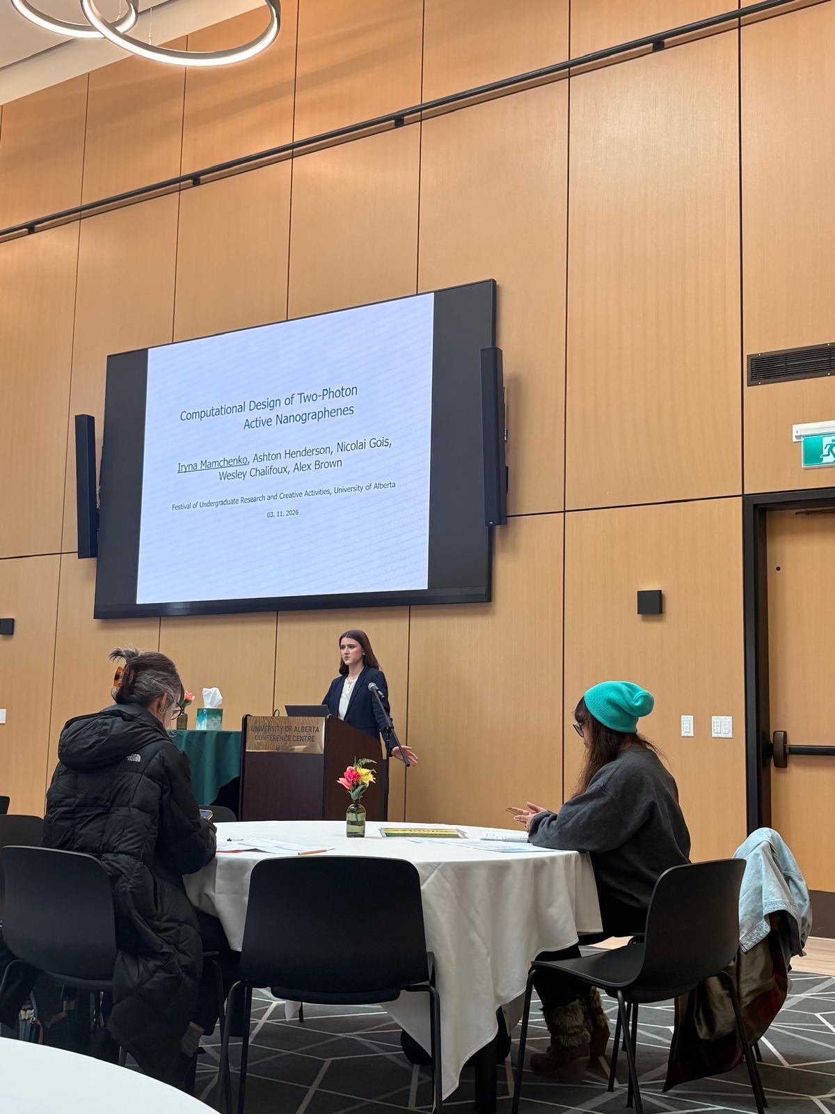 Iryna presents a talk on her CHEM 499 work “Computational Design of Two-photon Active Nanographenes” at the University of Alberta’s Festival of Undergraduate Research and Creative Activities (FURCA). This research is a collaboration with Professor Wes Chalifoux and his student Nicolai Gois. Congratulations Iryna on a great talk!