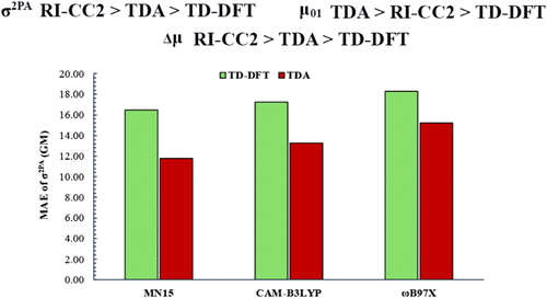 Two-photon absorption (2PA) is a powerful tool in nonlinear optics, enabling advanced applications like high-resolution microscopy and photodynamic therapy. In this study, we explore the 2PA properties of 20 chromophores using time-dependent density-functional theory (TD-DFT), TD-DFT with the Tamm–Dancoff approximation (TDA), and the resolution-of-identity approximation in conjunction with the second-order approximate coupled-cluster (RI-CC2). TDA’s performance in predicting 2PA properties remains insufficiently characterized compared to (full) TD-DFT, where the functionals CAM-B3LYP, MN15, and ωB97X are used, and their results are compared to RI-CC2. This comparison involves assessing key photophysical properties, including 2PA cross sections (σ2PA) and dipole moments (μ00, μ11, μ01, and Δμ). Among the tested functionals, MN15 demonstrated the lowest mean absolute errors (MAEs) for the computed photophysical properties for both TDA and TD-DFT. Our findings indicate that TDA captures qualitative trends and provides slightly more accurate quantitative predictions with generally lower MAEs than TD-DFT. These findings suggest that the use of TDA has significant potential as a cost-effective alternative to (full) TD-DFT for predicting 2PA properties.